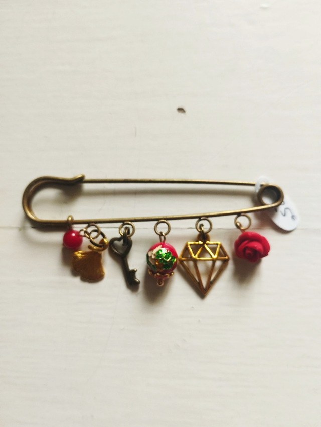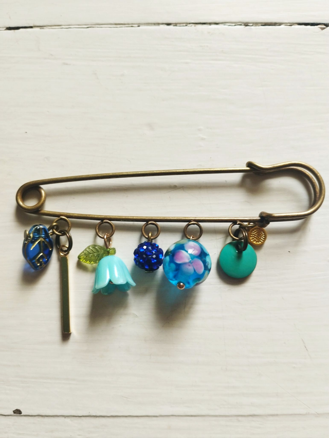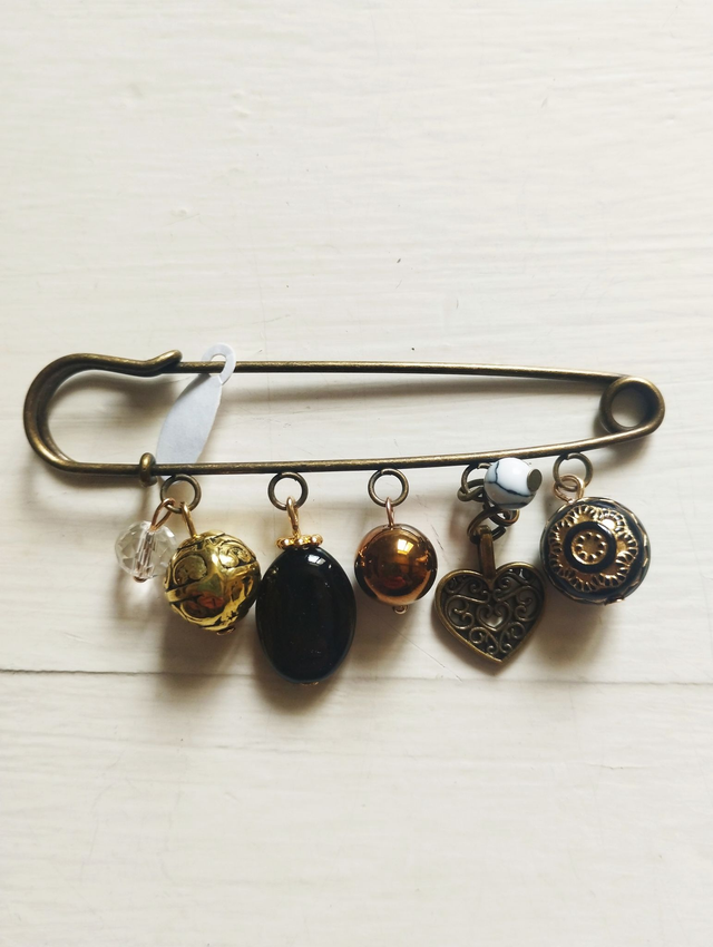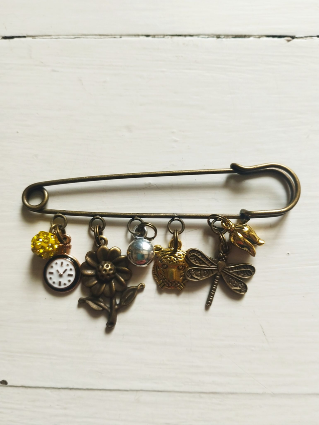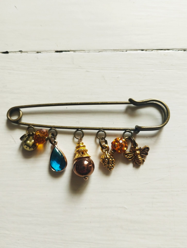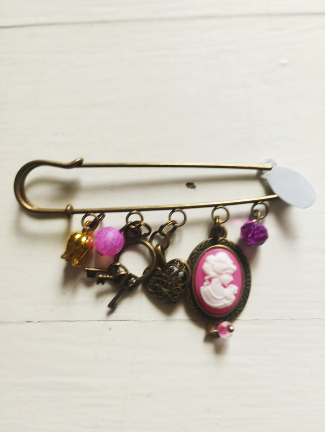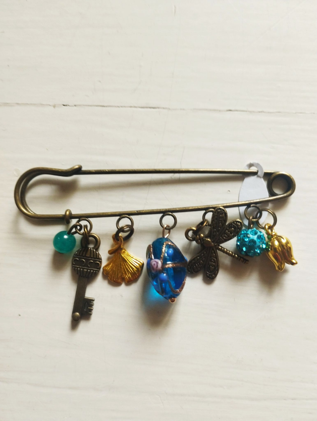 Broches métal bronze avec breloques métal, pierres, strass...