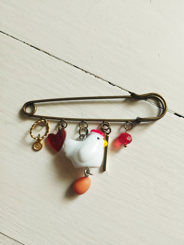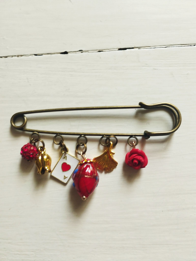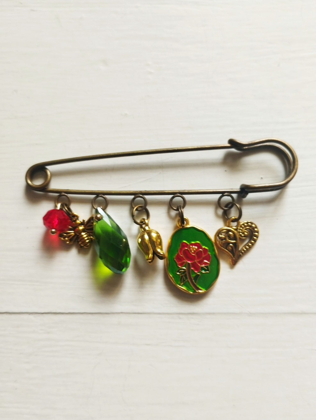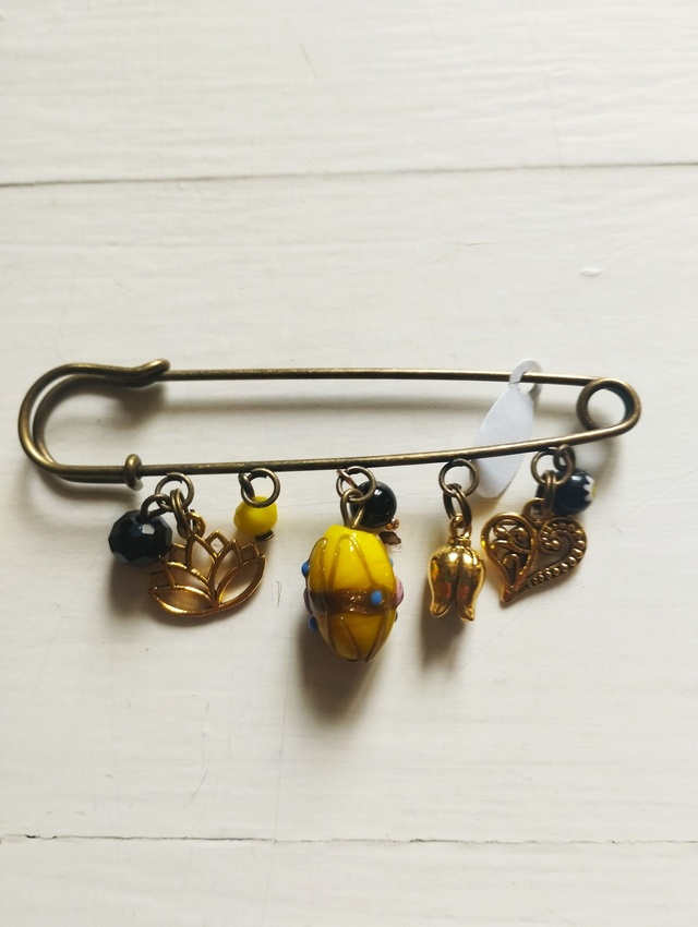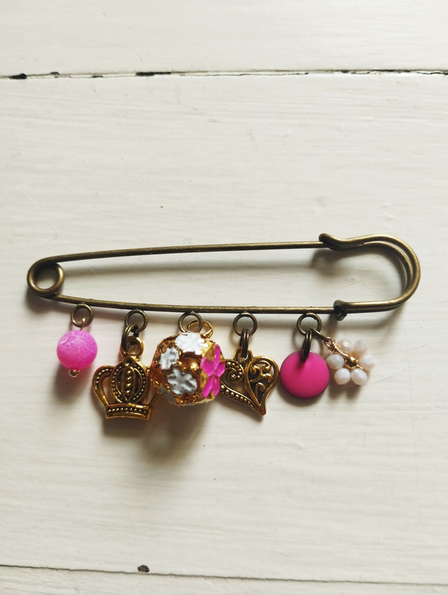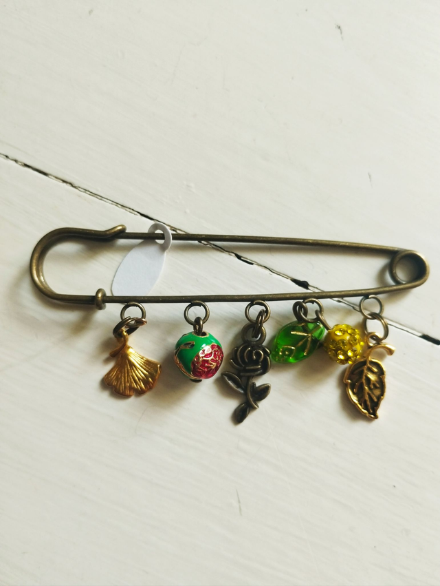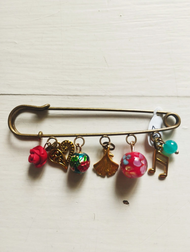 Broches métal bronze avec breloques métal, pierres, strass...